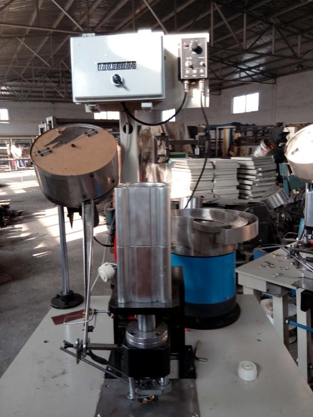 4.根據(jù)生產(chǎn)要求把相應(yīng)的紐扣或雞眼倒入打扣機(jī)臺(tái)面上的左右槽內(nèi),打開電源開關(guān),讓打扣機(jī)通電。